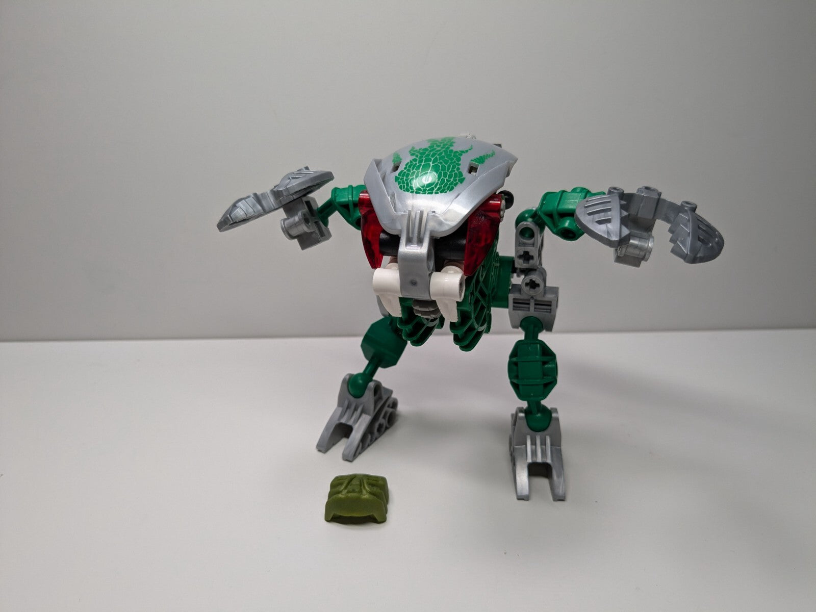 Description: Vintage Bionicle set with metallic green Krana. Lehvak-Kal is the fastest and most unpredictable Bohrok-Kal. Its vacuum shield gives it two powerful modes of defense, and there is no way for a Toa Nuva to know which it will choose. Lehvak-Kal makes full use of the terrain, and can disappear into the jungle in an instant. Lehvak-Kal’s vacuum shield can suck all the air out of a given area, causing a destructive implosion. It can then release the evacuated air in a single blast that has the power to smash through solid rock.